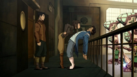 Zhu Li paused to think and said it was an interesting proposal she had not considered due to the evacuee crisis. Tenzin assured her that would make her an exemplary candidate, as she was so dedicated to the people. Korra agreed, stating that it would be nice to work with a president she could see eye to eye with. Zhu Li paused and said she would take it under advisement, and asked Tenzin to leave with her to oversee some shipments that would be coming in.