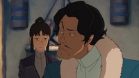 Zhu Li was present on Varrick's yacht when Asami and Bolin boarded in order to negotiate a business deal with the wealthy tycoon. She carried out tasks for her boss without even being asked, gesticulating for certain bystanders to move from their seats so that Varrick could take their place. Afterward, she gave the new arrivals some tea and began to play the motion picture projector to comply with Varrick's request. She continued to tend to the guests' refreshments and to the orders of her employer, even assisting Asami in getting to her feet after a minor fall, before once more taking her place in the background. Zhu Li later attended the Glacier Spirits Festival banquet and sat at the same table as Varrick, Ginger, Bolin, and Mako.[6]