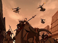 As the Fire Nation contingent pressed on, a group of Kyoshi Warriors also noticed them, and organized an ambush. Though surprised, the prince and his soldiers fended off the attack, but could not stop the local fighters as they retreated. Angered, Zuko ordered to continue the advance to the nearby village.[1]