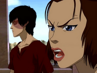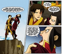 Zuko and Azula's relationship finally reached a defining point when he fought her to prevent her from killing their mother, Ursa. When she asked him why he had not killed her when he had the chance, he replied that no matter how badly messed up their relationship was and might always be, she would never stop being his sister, someone whom he cared about. Azula subsequently ran away from her brother, ignoring his pleas for her to come back so that he could help her.[21] Zuko searched in vain for her for days in the valley until he was forced to give up and return to the Fire Nation. He expressed concern over Azula's well-being as his mother confided on her worries of Azula and appeared to regret that he could not understand what his sister was thinking and how she could be happy.[22]
