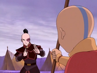 When Zuko made his opinion known that Aang needed to kill Ozai in order to save the world, Aang became very frustrated and criticized Zuko's advice.[46] When Aang went missing the next morning, Zuko was genuinely concerned over his disappearance and went to great lengths to track him,[37] confessing to Katara his worries about Aang were greater than his worries about fighting Azula.[16]