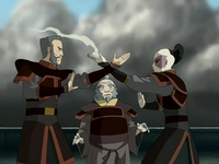 When carrying out their escape plan, Zuko almost sacrificed himself trying to save Hakoda and their companions by stopping at the end of the platform while the rest boarded the gondola and pushed down the lever so that the gondola slowly moved off. This left behind Zuko, who successfully broke the lever to make sure the Boiling Rock guards could not stop them before running toward the departing gondola. Zuko flew over the railings with fireballs being launched at him by the guards below and was caught by Sokka.[14] When Azula and her airships attacked the Western Air Temple, Zuko was wholeheartedly prepared to hold off his sister and her men by means of giving his friends, including Hakoda, enough time to escape.[35] After the end of the War, Hakoda came to the Fire Nation Capital for Zuko's coronation.[17]