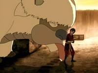 As an enemy of Team Avatar, Zuko was originally an enemy of Appa. At Ba Sing Se, Zuko freed Appa from the Dai Li, gaining Appa's trust and respect.[26] While at the Western Air Temple, Appa was the first to approve of Zuko's entrance into the group, showing this by licking him. The fact that Appa approved of Zuko was one of the reasons Aang and the others accepted him into the group.[35] The first time Zuko rode Appa, he stated that he thought "this thing would be a lot faster".[56] Prior to the arrival of Sozin's Comet, Appa apparently felt comfortable enough to let Zuko steer him.[15][37]